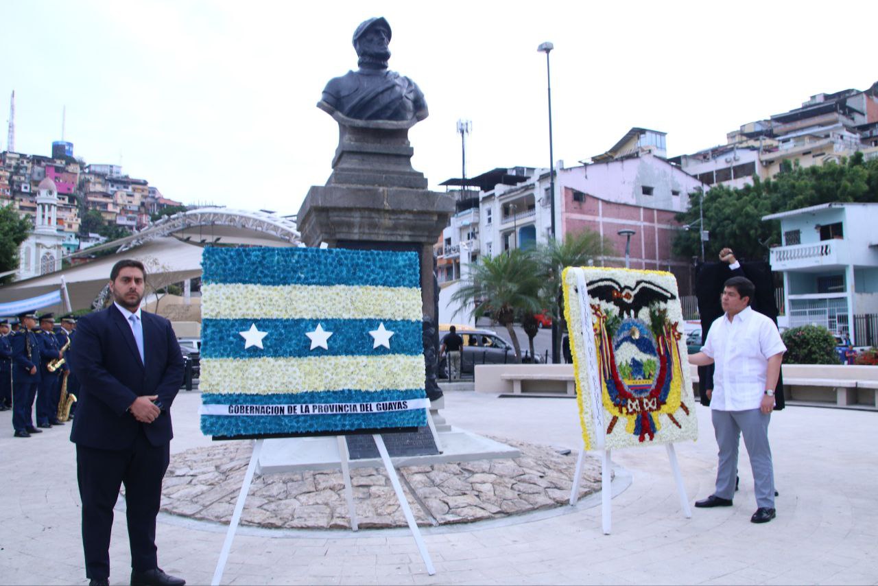 En conmemoración de los 489 años de la Fundación de Santiago de Guayaquil, se llevó a cabo una emotiva ceremonia de colocación de ofrendas florales en el busto de Francisco de Orellana, ubicado en las faldas del Cerro del Carmen. El gobernador Vicente Auad acompañado del secretario de la Administración Pública, Arturo Félix presidieron este acto cívico, cultural.