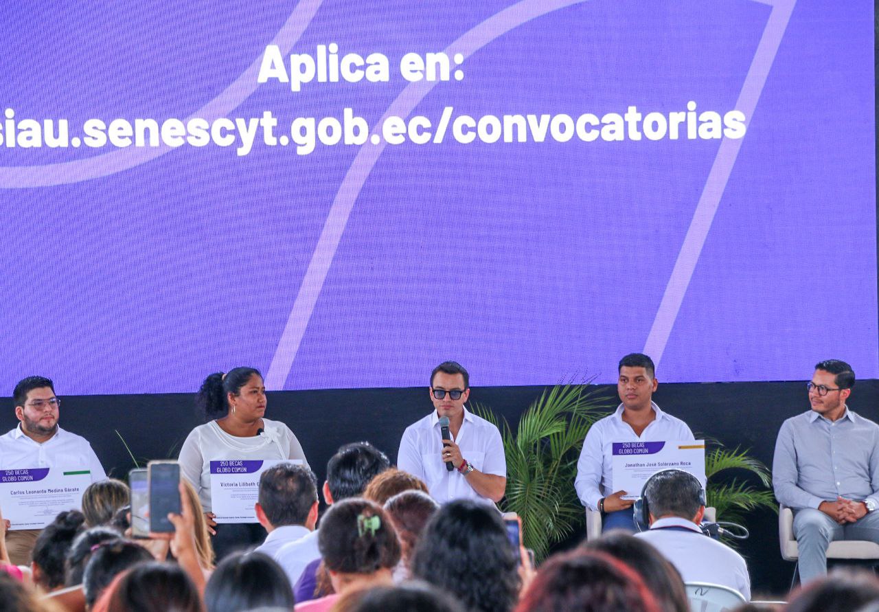 250 personas recibieron esta mañana, 15 de abril de 2024, las becas otorgadas por el programa “Globo Común” a cargo de la Secretaría de Educación Superior, Ciencia, Tecnología e Innovación (Senescyt). El presidente de la República, Daniel Noboa Azin, desde el Instituto Superior Tecnológico Guayaquil se dirigió a las beneficiarias y beneficiarios: “Ustedes representan a la nueva generación que está