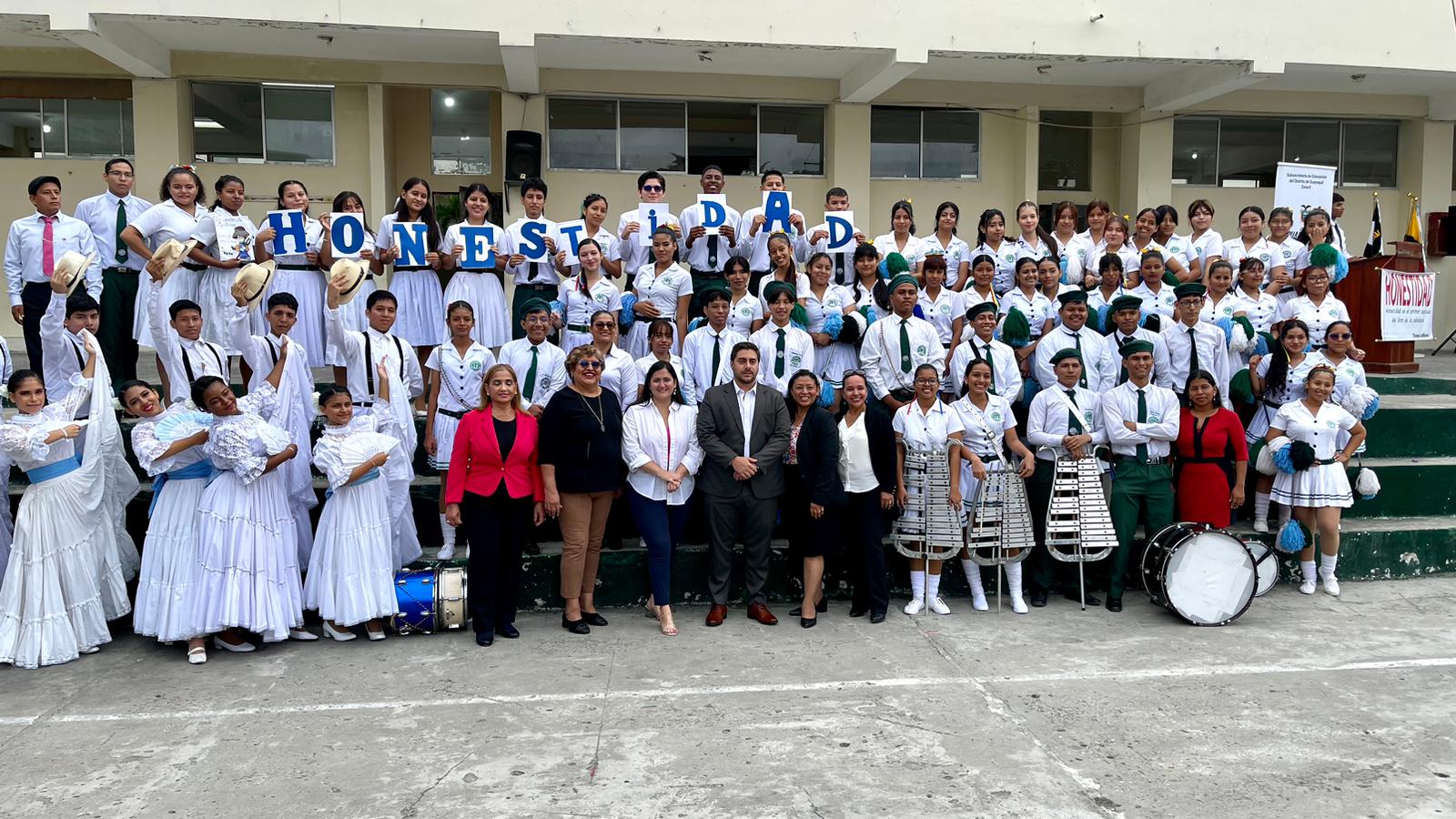 Las palabras de bienvenida estuvieron a cargo de Daniela Febres Cordero, Subsecretaria de Educación, quien destacó la importancia de la educación en la formación de ciudadanos responsables. Un grupo de estudiantes presentó un acróstico sobre el valor de la honestidad, seguido de una disertación que profundizó en la importancia de este valor en nuestra sociedad.