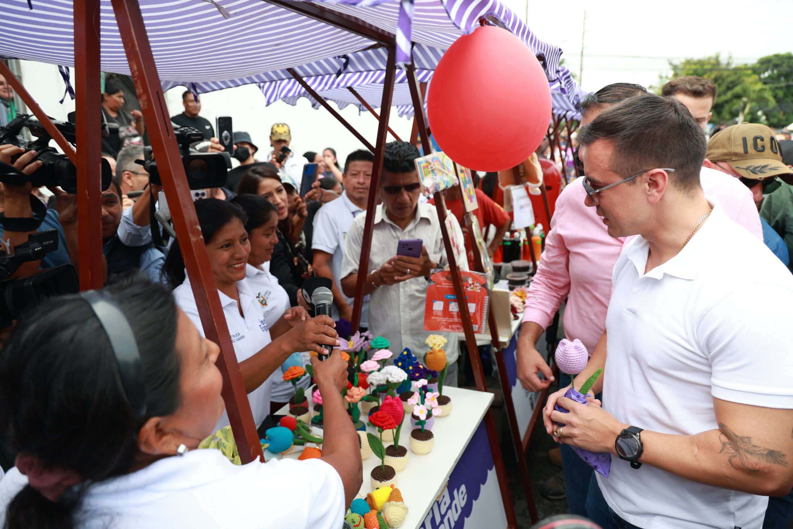 El presidente Daniel Noboa visitó el stand de Maribel Conforme, artesana que elabora bolsos, carteras y flores tejidas a mano, y destacó su habilidad. Luego, conversó con Luz Marlene Palacios, quien elabora bollos de albacora, bocadillos de masa verde y maní envuelto en hoja de plátano. Por su parte, Laura Barcia Macías, quien recibió un crédito de BanEcuador para su negocio, expresó: “El Presidente sí cumple con las mujeres”.